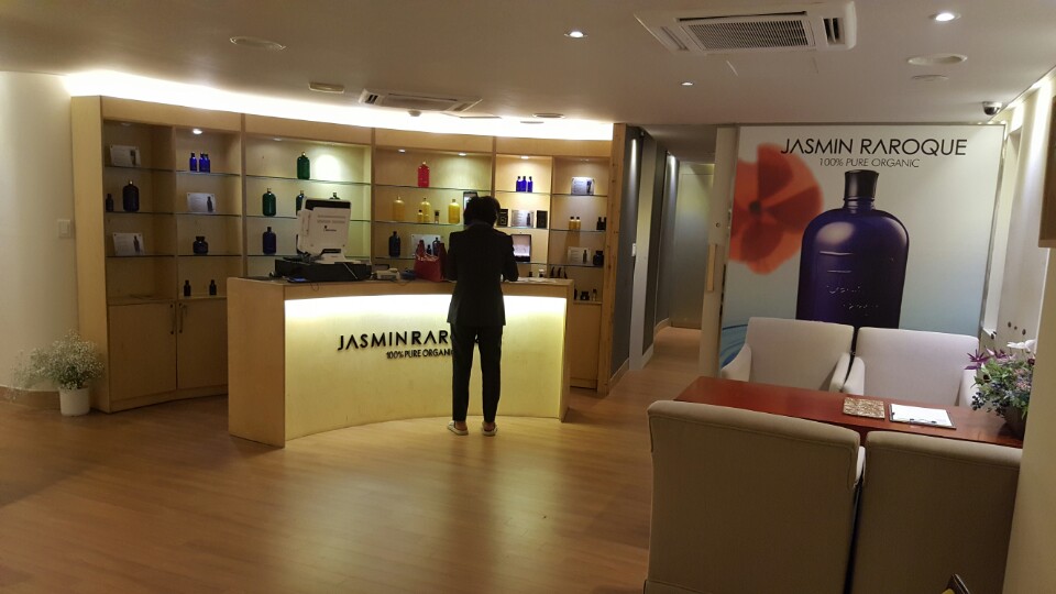 今回は「JRスパ」おすすめの「メルブランシュオイル120ml」を贅沢に使った2時間コースの体験です!「JRスパ」は、芸能事務所やブランドショップが多く位置し、セレブが集まることでも知られている清潭洞(チョンダムドン)に位置しています。お店の玄関にはインターホンがあり、インターホンを押し待っていると院長さんが扉を開け出迎えてくれました。院長さんはとても綺麗で、それだけでエステ体験への期待が高まりました。店内に入るとアロマのいい香りが漂っており、高級感のあるインテリアと照明で演出されていました。まずは説明を受けるため部屋に案内されました。1人1人に合わせたオーダーメード型のプログラムを導入するためにアンケートに答えます。血圧の状態や生理周期など、いくつかの質問によって顧客の健康状態を知り、それに合わせた施術を行うとのことでした。温かいお茶を飲みながら院長さんが丁寧に商品とエステの流れを説明してくださいました。エステ体験後「JASMIN RAROQUE(ジャスミン・ラルク)」の商品を気に入れば、全て「JRスパ」で購入可能です。お値段は少し高めですが、1セットで約1年ほど使えるそうです!こちらの商品を使うのと使わないのとでは肌年齢に30倍も差が出るとのこと!購入価値はありそうですね!