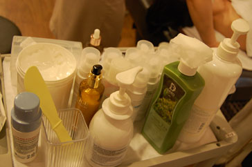 さて、ベッドに横になるといよいよ、エステが始まります!エステを担当してくれるお姉さんのお肌がつやつやしていて、期待が高まります!!まずは、メイク落としからです。たっぷり付けた、ウォータープルーフのマスカラも専用のメイク落としで、丁寧にやさしく落としてくれます。クレンジングミルクを使って、メイクを落とし、海面を使ってやさしくふき取っていきます。メイクを落としたあとは、ディープクレンジングをしていきます。ディープクレンジングは、エンザイム酵素パウダーを使いお肌の古くなった角質や、老廃物を取り除くために行われます。ディープクレンジングが終わると、海面と柔らかなコットンでふき取ります。
