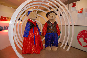 スキンアニバーサリー・ビューティタウンには、お子様も楽しめるテディベアギャラリーが用意されています。テディベアギャラリーでは、韓国人気K-POPスターや、人気のドラマの主人公に扮した可愛いテディベアたちが、展示されています。日本でも人気のKARA、ビッグバン、少女時代に、ドラマコーナーには「冬のソナタ」、「フルハウス」などが展示されていましたよ!^^メインの広いスペースには、写真撮影にピッタリの、ベンチや、顔の部分がくりぬかれた写真撮影用の看板などが用意されていました。