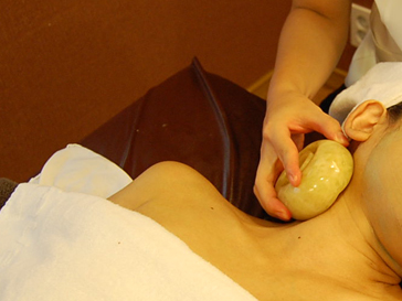 次は、ヒスイのストーンテラピーがサービスで受けられました。温められたヒスイを使い、デコルテなどを中心にマッサージが行われます。じんわりと温かいヒスイが、コリや疲労を解消してくれます。