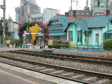 地下鉄3号線玉水駅7番出口を出て、高架沿いに北へ歩くと正面の丘の上に教会と屋上の家が見えてきます。長い石段を上ると、カーブしたスロープがあります。ドラマにも出てきた鉄の階段を上がりきるとヨンスの家があります。