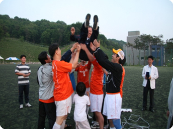 学生時代、サッカーの経験がある人や実際にKリーグ(日本で言うJリーグ)の元選手も参加していますし、若者に混じって活動するのは