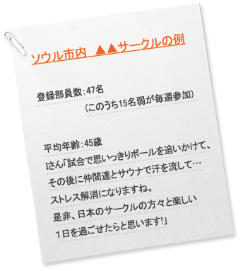 韓国でも、一生涯サッカー一選手でいたいという愛好家は多く、シニアのサークルも盛んに活動しています。