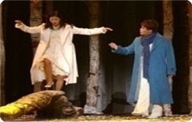 薄暗い照明の中に見えるのは、白樺の森と目が覚めるような雪景色をイメージした舞台。