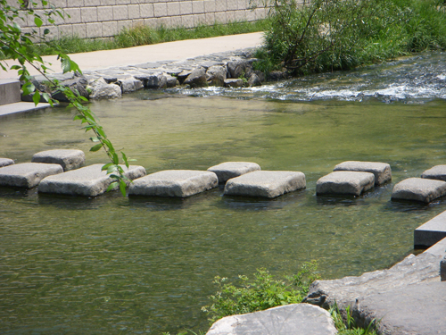 韓国八道(京畿(キョンギ)、忠清(チュンチョン)、全羅(チョンラ)、慶尚(キョンサン)、江原(カンウォン)、黄海(ファンヘ)、平安(ピョンアン)、咸鏡(ハムギョン))から運ばれた代表的な石材で作られた「八石潭(パルソクダム)」は幅21m、長さ60mの区間に設置されていて、噴水から流れ始めた水が石と石の間を通り抜け清渓川の水と合流して河川へ向けて流れている。それぞれの石は韓国の象徴であり、韓国全土の和合と統一された未来像が8個の石(八石)と水(潭)に込められている。
