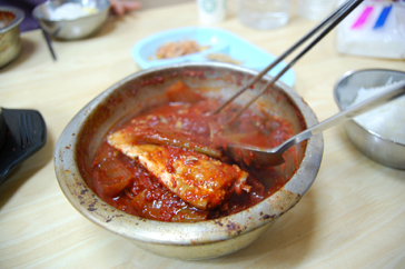 太刀魚と大根を甘辛く煮込んだ料理、カルチジョリムの専門店が細い路地に並んでいる。