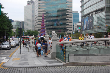 高層ビルが立ち並ぶソウル中心部に、勢いよく流れる滝こそが、まさに清渓川のスタート地点である。清渓川を象徴する広場であり、三色のライトが照らされるキャンドル噴水と、4m下に流れる二段の滝がある。夜になると各方向からのライトアップと滝が幻想的な雰囲気を醸しだし、見どころ満載。