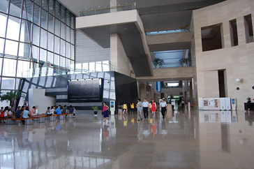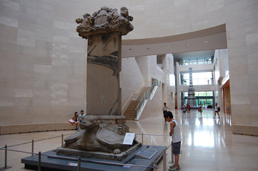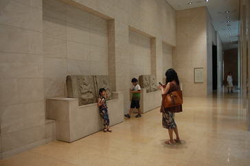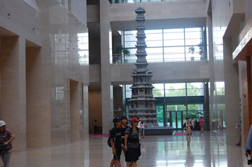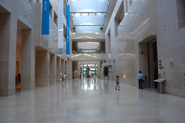 展示空間をつなぐ廊下である‘歴史の道’は、吹き抜けのガラス屋根になっていて自然の光が差し込み、まるで屋外にいるような明るさ。博物館内の展示室は歴史の道を中心として左右両側にそれぞれ3階建ての展示室構成になっており、この通路にある石塔をどこからでも眺めることができる。それと同時に、博物館の規模の大きさを改めて実感することだろう。