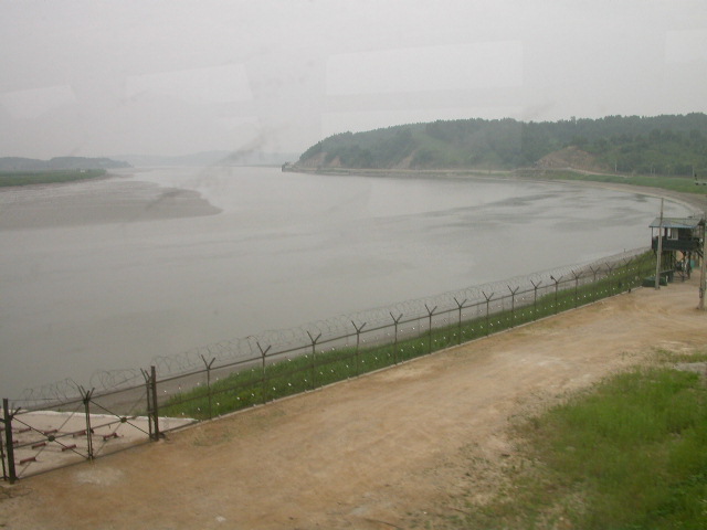 ソウルからDMZへ向かう途中、左の車窓には鉄条網が張られたイムジン(臨津)河が。