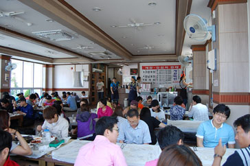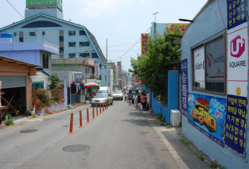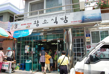 バスの停留場「국동주텍단지(クッドンジュテッダンチ)」から、『보산게장거리(ボサンケジャンコリ)=カンジャンケジャン通り』までは徒歩3分ほどです。通りには、『보산게장거리(ボサンケジャンコリ)』という青い看板が出ています。海側に向かって、『보산게장거리(ボサンケジャンコリ)』の坂道を下って行くと、左手にカンジャンケジャン専門店「황소식당(ファンソシクタン)」がありました。お店の前に行列が出来ていて、味にも期待が出来そうです!もう少し海の方向に進むと、右手にこちらもカンジャンケジャン専門店「두꺼비게장(トゥコビケジャン)」が見えてきます。こちらのお店も長蛇の列ができていました。今回はこちらの「두꺼비게장(トゥコビケジャン)」さんでカンジャンケジャンをいただきました^^
