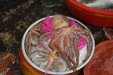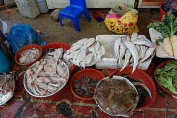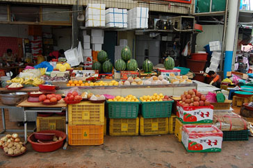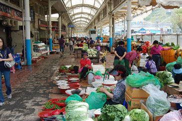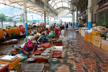 市内バスが無料なので、万博の会場に行く前に少し寄り道をして、麗水(ヨス)の市場に立ち寄ってみることにしました^^市場は、中央市場、キョドン市場、ソ市場の3ヶ所です、中央市場は、服など衣料品が売られており、キョドン市場、ソ市場は野菜や果物、魚介が売られています。今回は、キョドン市場を見学してきました!キョドン市場へは、麗水(ヨス)エキスポ駅から2番バスに乗車し「キョドン市場」で下車します。「キョドン市場」停留所は、'デハン生命ビル'の大きなガラス張りのビルが目印です。'デハン生命ビル'の前にある横断歩道を渡って、左側に進むとキョドン市場があります。キョドン市場では、ワタリガニが7匹で10,000ウォンととっても安かったです!日本では見かけない珍しい魚なども沢山売られており、見学をするだけでも楽しめます。魚介を売るアジュンマたちの元気な姿が印象的でした!