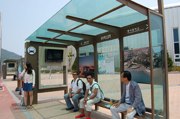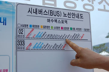 ソウルトモの取材班が、ソウルの龍山(ヨンサン)駅から8:05発のKTXに乗車して、麗水(ヨス)エキスポ駅に到着したのが11:33分!!麗水(ヨス)万博の会場は目の前ですが、「腹が減っては戦ができぬ」ということで、入場前に腹ごしらえすることにしました^^;麗水(ヨス)万博が開催されている全羅南道(チョンラナムド)麗水(ヨス)市は、カンジャンケジャン(蟹のしょうゆ漬け)が有名だということで、バスに乗車してカンジャンケジャン目当てに麗水(ヨス)市内へ向かいました。市内へ向かうバスの停留場は、麗水(ヨス)エキスポ駅を出て右手にあります。有名な「カンジャンケジャン通り」までは、2番バスに乗って約20分ほど。「국동주텍단지(クッドンジュテッダンチ)」の停留場で下車します。なんと、万博開催期間中は麗水(ヨス)市内のバスが全て無料で乗車できるんです!
