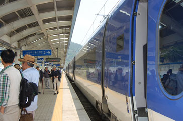ソウル市内から麗水(ヨス)万博までは、龍山(ヨンサン)駅から韓国の特急列車KTXに乗車し、麗水(ヨス)エキスポ駅まで約3時間かかりました。KTXの車内は綺麗で、座席もゆったりとしており快適でした。麗水(ヨス)万博の会場は、KTXが終着する麗水(ヨス)エキスポ駅の目の前ととっても便利です! KTXを降りて麗水(ヨス)エキスポ駅の外にでると、万博マスコット「ヨニ」と「スニ」の像が向かえてくれました!