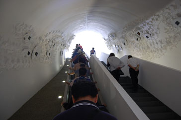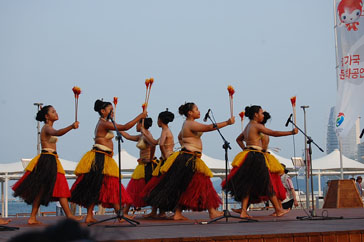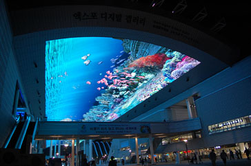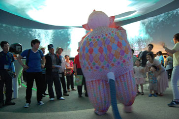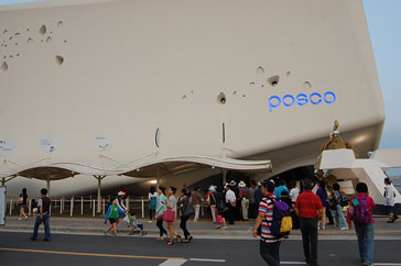 ポスコ館の待ち時間は、約15分ほどでした。ソウルなど遠方から来場している方々が、早い時間に帰宅の途に着くためか、夕方になるに連れ待ち時間が短くなるようです。ポスコは、韓国最大の製鉄会社です。ポスコ館では、風の力でダンスをする風船人形の動きが、中に人が入っているように錯覚するほど、人間そっくりの動き方をしていて面白かったです。来場していた子供たちも不思議な風船人形の動きに釘付けになっていました!!ポスコ館は、体験型の施設なので子供たちにも人気のようです。