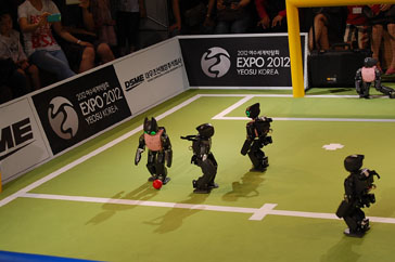 ロボット館では、ブラックチーム、ピンクチームに分かれて、ロボットのサッカー対決も行われていました!来場者もブラックチーム、ピンクチームに分かれて、自分のチームを応援します!ソウルトモの取材班は、ピンクチームを応援しました!ピンクチームがんばれ~!!ちなみに、2-0でピンクチームの勝利に終わりました
