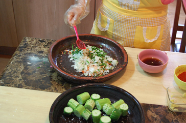先ほど塩漬けにしておいたきゅうりに、キムチの材料を詰め込んでいきます。全てのきゅうりに材料が詰められたら、余った材料はきゅうりの上に載せ、味を馴染ませます。きゅうりをしっかりと塩漬けにするのがポイントだそうです!
