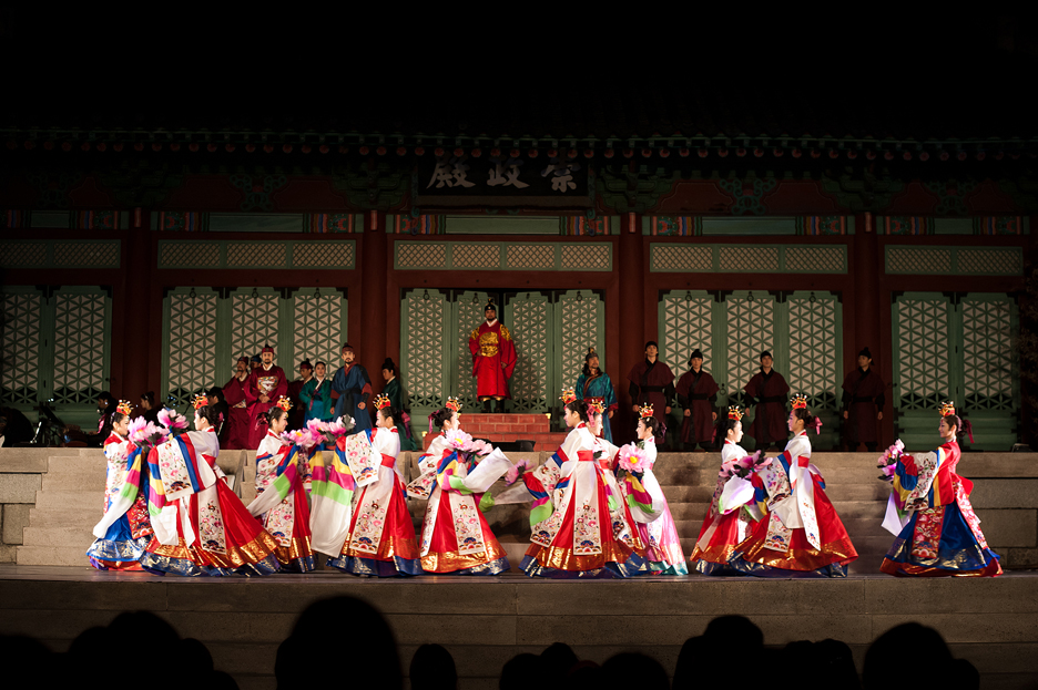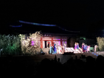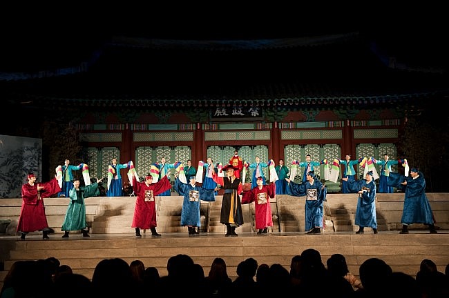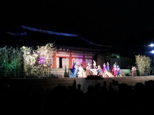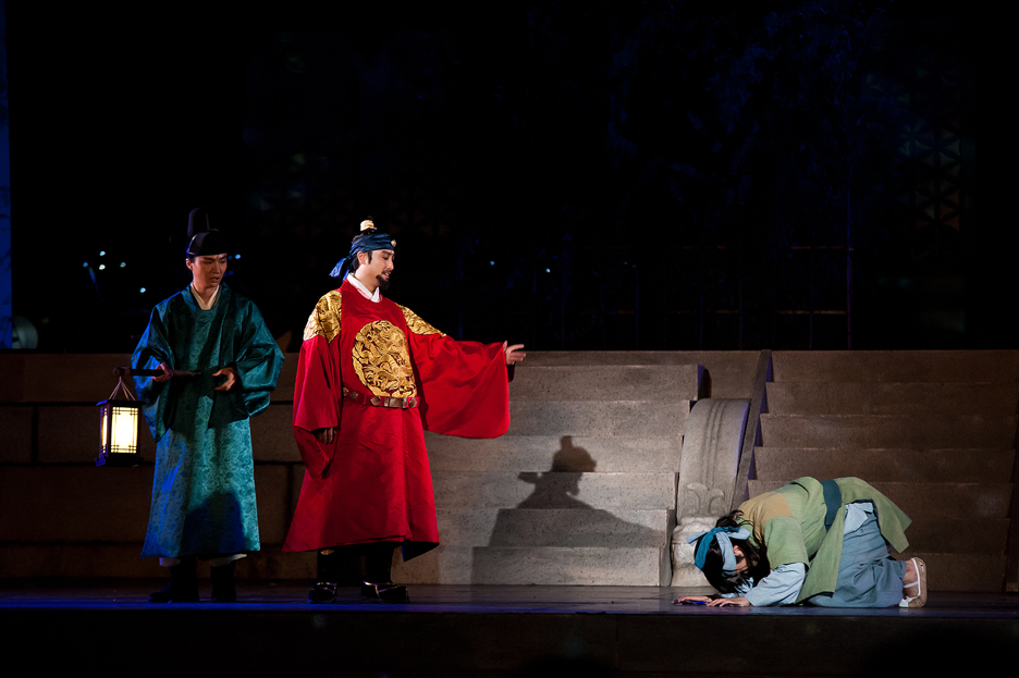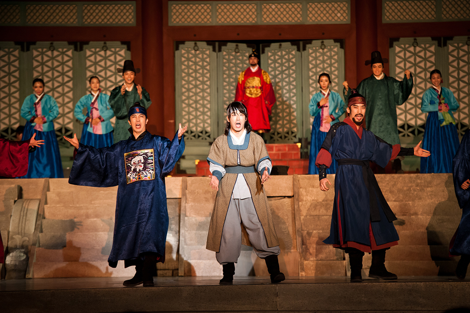 慶熙宮(キョンヒグン)崇政殿(スンジョンジョン)を背景に多彩な伝統芸術で、世界最高の科学者「ジャン・ヨンシル」の人生をミュージカルで表現する古宮ミュージカル「天上時計」!当時の歴史的な人物を登場させ臨場感を付与しながらチャン・ヨンシルと恋人イェソンとの切ない愛の話を追加して劇的おもしろさを加えた作品です。舞台の上では華麗な宮中舞踊と民俗舞踊が現代的なミュージカルと調合され1つになり、12パート25人の大合唱が作り出す巨大なスケールは見どころ満載です。