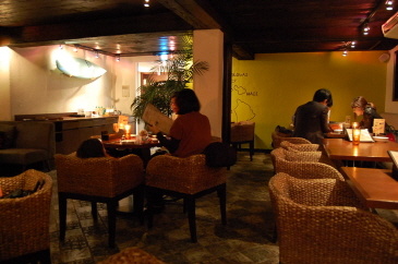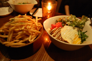 入口から石の階段を上った私の目の前には、広い空間に作られたテラス席が!真っ暗な中に点る明かりが、まさに南国のビーチ気分を一瞬で味わせてくれました。お店に入るとシェフが「アロハ~」と言ってお出迎えしてくれました。机の真ん中にはキャンドルにオレンジ色の明かりが点されており、店の外の賑やかさとは違い、静かな雰囲気に心が和むようでした。私たちはハワイアン料理「ロコモコ」を注文しました。白ご飯の上にハンバーグと目玉焼き,野菜がのっていて、日本でもとても人気がありますよね!日本人が好む「テリヤキ味」を食べたんですが、本当に日本人が好きな甘い辛いソースで、そのソースで味がつけてあるハンバーグは、日本で食べるのと同じくらいおいしかったです。ハワイアンミュージックに心を癒され、ゆっくりとした時間を過ごすことができました。