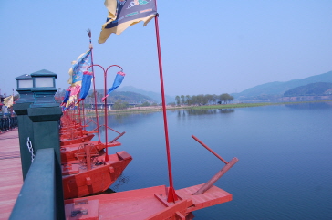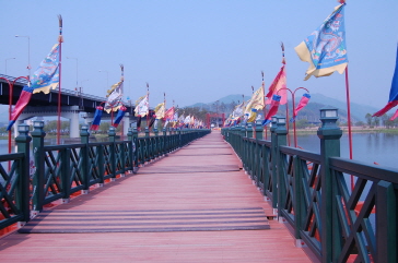 洗美苑に入るにはまずこの橋を渡ります。この橋、よく見ると舟の上にあって、苑へと続く長い道はとっても幻想的!橋の両端には黄色や赤のカラフルな旗が飾られて韓国らしい雰囲気がよく出ています。