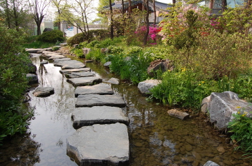 庭園を流れる小川には石の足場が続き、童心に返ってぴょんぴょんと渡りたくなってしまいます。